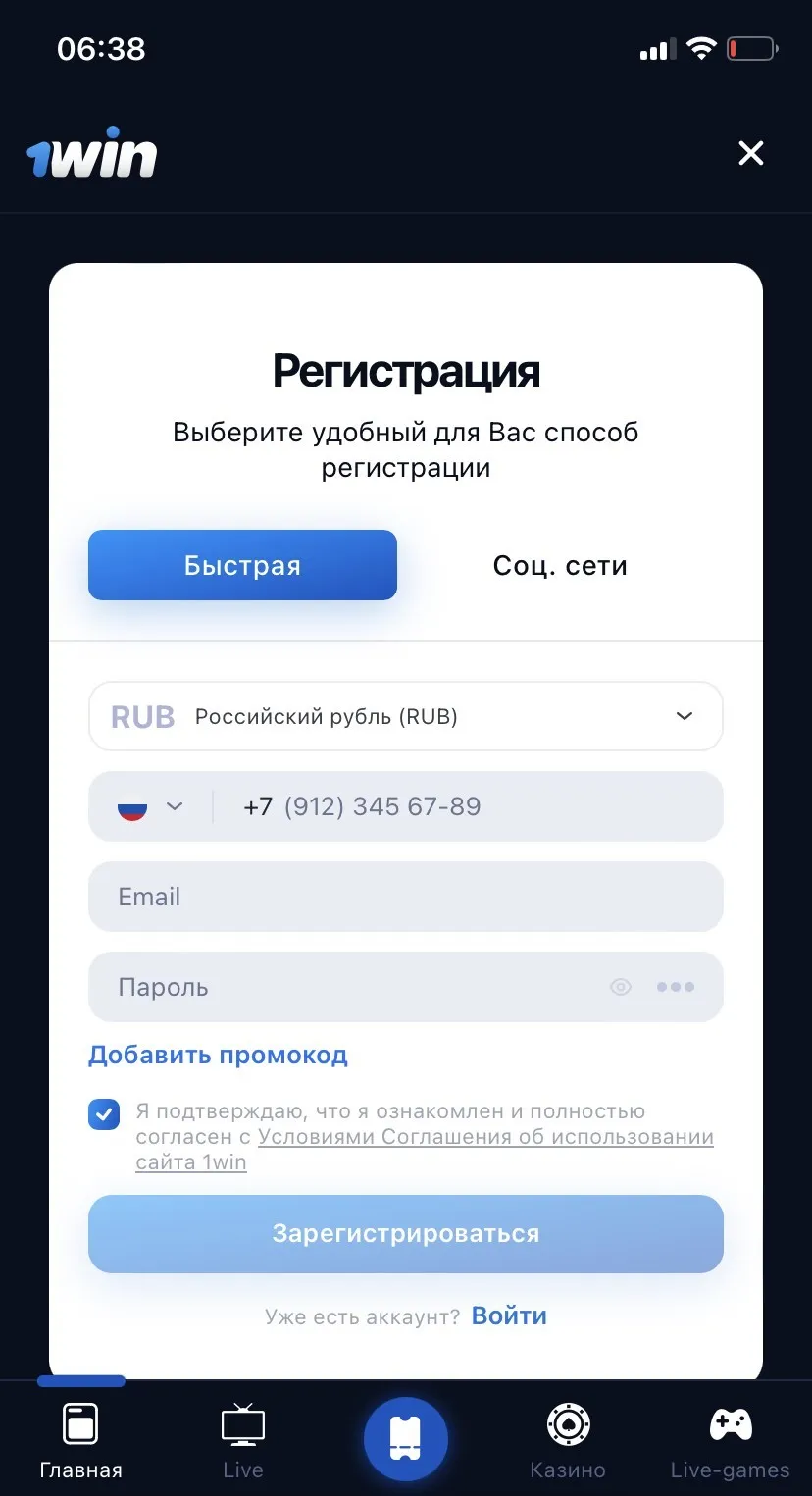 Регистрация 1win